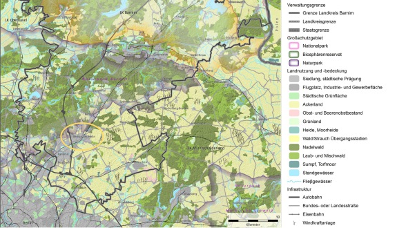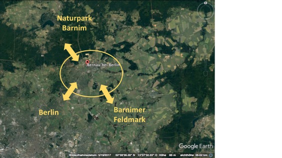 Die Stadt Bernau bei Berlin liegt am nordöstlichen Rand der Metropole Berlin im Nordosten Deutschlands. Die Stadt hat 39.000 Einwohner*innen und umfasst ein Gemeindegebiet von 10.373 ha. Die direkte Umgebung von Bernau ist durch sehr unterschiedliche Landnutzungsformen und -intensitäten geprägt: im Norden durch die wald- und gewässerreichen Gebiete des Naturparks Barnim mit seinen wichtigen Naherholungsfunktionen, im Südosten durch die intensive Landwirtschaft der Barnimer Feldmark und im Südwesten durch den sich verdichtenden urbanen Raum Berlins (s. Abbildung 1 und Abbildung 2). Die entsprechenden Ökosysteme prägen und beeinflussen die Stadt Bernau, deren innerstädtische Ökosysteme und letztlich die Lebensqualität der Bewohner*innen.