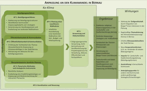 Durch das Projekt soll eine erhöhte Sichtbarkeit für das Thema Klimawandel und (ökosystembasierte) Anpassung sowie relevantes Handlungswissen innerhalb der Stadtverwaltung, der unterschiedlichen Gruppen von Akteur*innen und der interessierten Bürger*innenschaft geschaffen werden. Dies umfasst eine intensive Öffentlichkeitsarbeit und die Durchführung von Veranstaltungen (z.B. Workshops, Vortragsreihen). Parallel sollen in einem breiten Beteiligungsprozess von Akteur*innen und interessierten Bürger*innen die Anpassungsbedarfe und -strategien für die Stadt Bernau identifiziert und sowie eine konkrete Leuchtturm-Maßnahme detailliert ausgearbeitet werden. Weiterhin sollen die strategischen Planungsinstrumente - Landschafts-, Flächennutzungs- und Bebauungspläne – auf ihre methodische und inhaltliche Klimawandelrobustheit analysiert und Handlungsempfehlungen zu deren Anpassung und Weiterentwicklung erarbeitet werden. In die Handlungsempfehlungen fließen die Ergebnisse des partizipativen Prozesses ein.