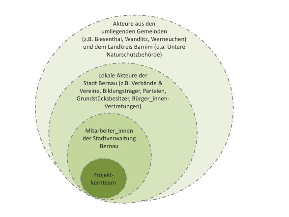 Zentrale Akteur*innen des Projektes sind gleichermaßen (i) Mitarbeiter*innen der Stadtverwaltung Bernau (ii) lokale Akteur*innen, und (iii) Akteur*innen aus den benachbarten Gemeinden und dem Landkreis Barnim (s. Abbildung 5).